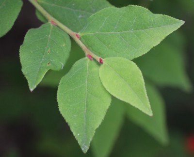 ・葉は互生。長さ2〜5cm、幅1〜2.5cmの卵状楕円形または広披針形。ふちには細かい鋸歯がある。裏面には短毛が生え主脈に白い毛がある。