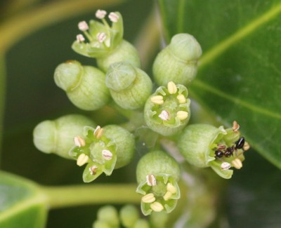 ・枝先に球形の散形花序を出し、淡黄緑色の小さな花を多数つける
