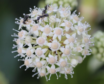 ・枝の先に球形花序を円錐状につけ、白い小さな花を多数つける。