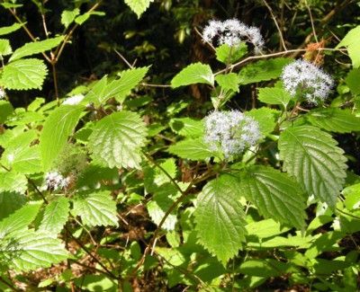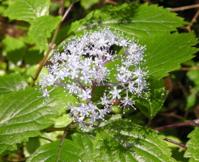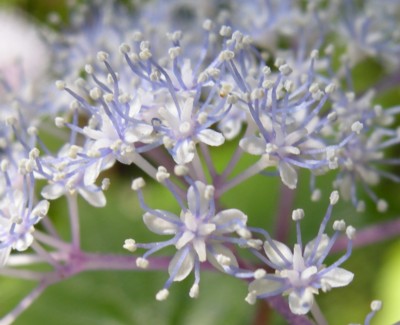 ・枝先に直径5cmほどの散房花序を出し、淡青紫色の花を多数つける。装飾花はない。