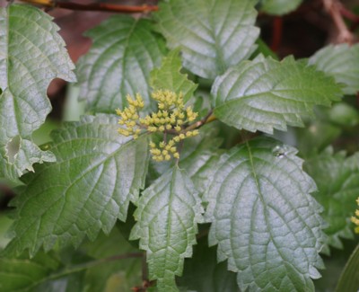 ・葉は対生。長さ5〜8cm、幅3.5〜6cmの卵形〜楕円形で、縁には大きな鋸歯がある。