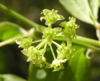 | ・雌雄異株。葉腋から散形花序を出し、淡黄緑色の花を多数つける。 |