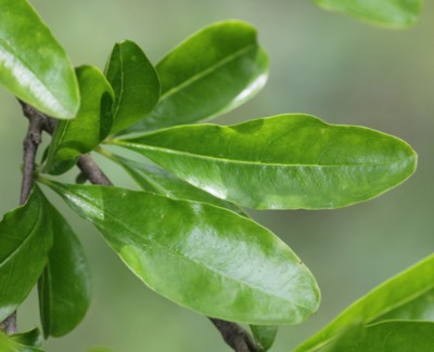 ・葉は対生。長さ2〜5cm、幅1〜2cmの長楕円形で全縁、無毛。表面は光沢がある。