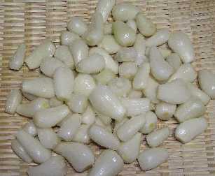 ☆ラッキョウは綺麗に水洗いして薄皮をむき、根と芽を切り落とす。