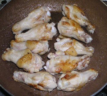 ・フライパンを熱しサラダ油をひき、鶏手羽元を並べて強火で色づくまで焼く。
