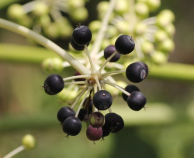 ・晩秋に白い花が咲き、緑色の実がなる。その実は、翌年の4〜5月に黒く熟する。