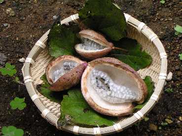 | ・秋に長球形の実がなる。果実は熟すと、縦に裂け果肉があらわれる。ゼリー状の白い実を、種子を吐き出しながら食べる。 |