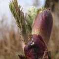・新芽から、わずかに葉が開いた程度の若芽の柄を、根ぎわから切り採る。