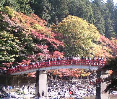 ・11月の紅葉のシーズンには、行楽客で混雑する。道路も5〜6km程、1時間以上の渋滞を覚悟しなければならない。800台ほど駐車できる駐車場もあるが、タイミングが悪ければ、駐車場の空き待ちとなる。民間の飲食店などの駐車場もあり、遠い所だと700円から、近い所だと1000円。ちなみに、町営の駐車場料金は500円。